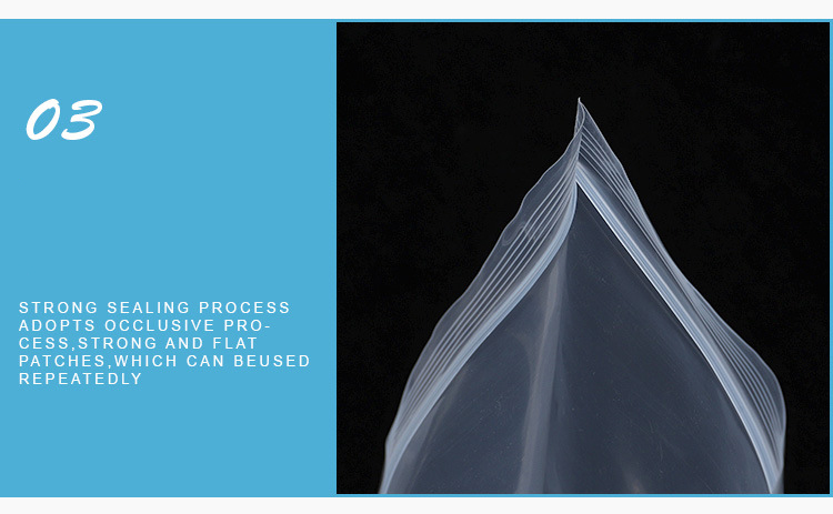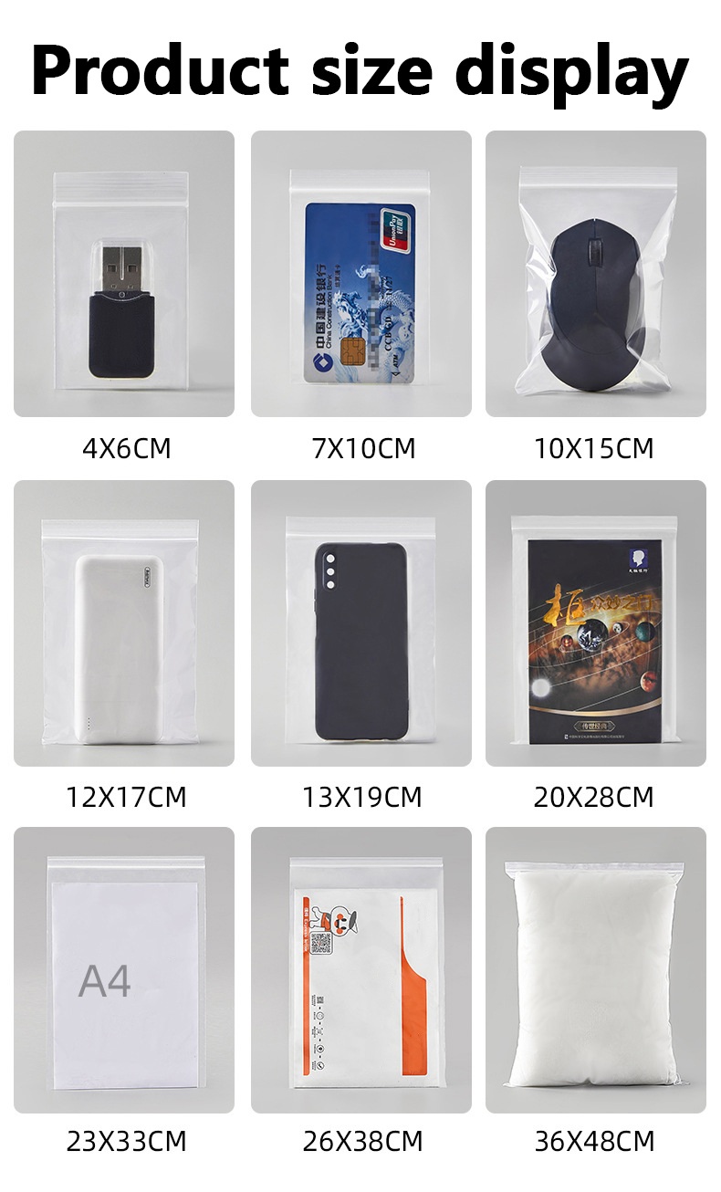 Application : les sacs ziplock refermables de différentes tailles conviennent à différents domaines, tels que le stockage, les vêtements, les chaussures, les bijoux, les accessoires médicaux, les accessoires matériels, etc.